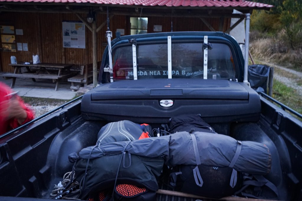Μετά από μια γρήγορη κούρσα πάνω στην καρότσα από το αγροτικό του, ήμασταν ήδη τακτοποιημένοι σε δυάρι με σόμπα και είχαμε και ένα ζεστό κριθαρότο να μας περιμένει…και γι’αυτό τον ευχαριστούμε πολύ!!
