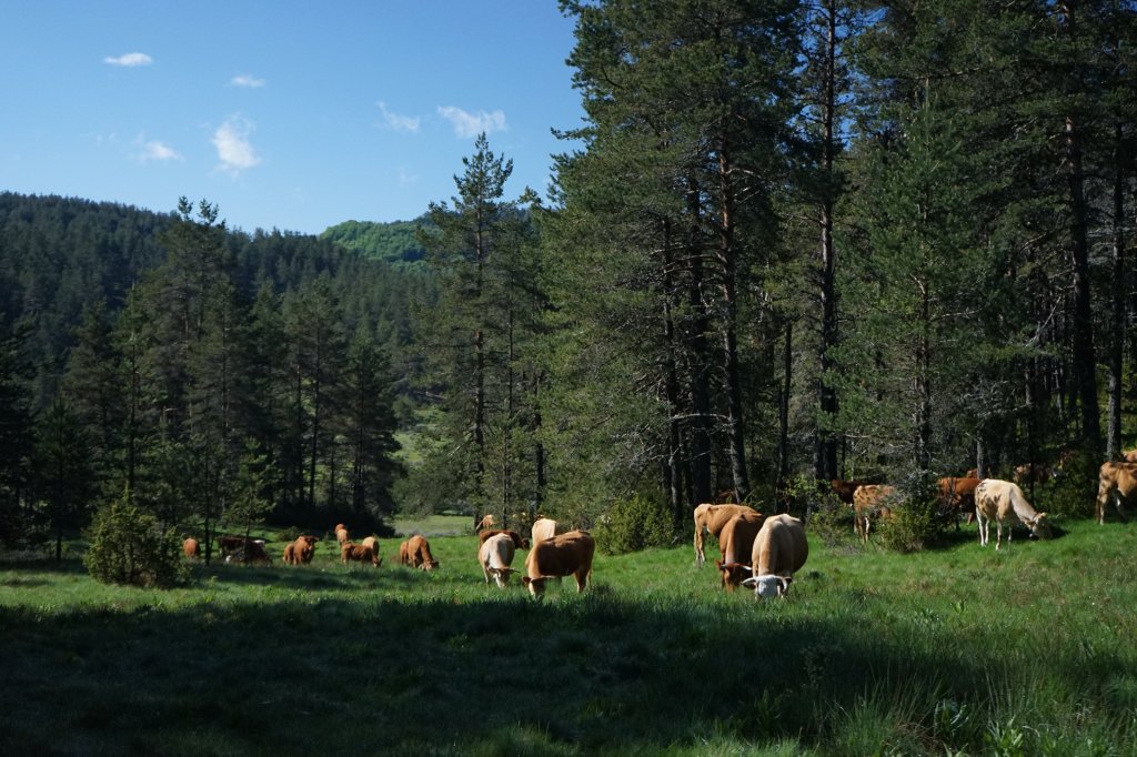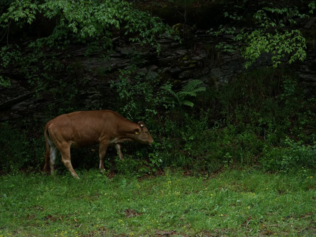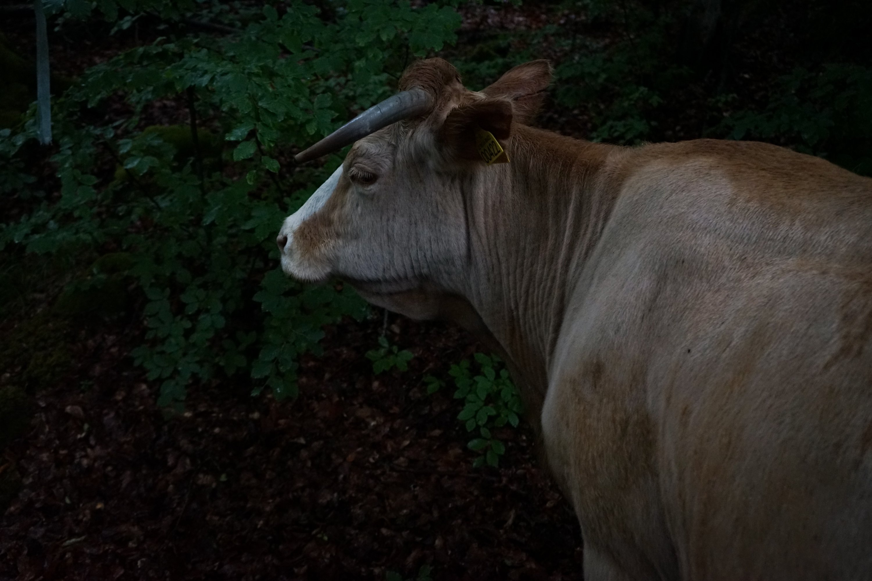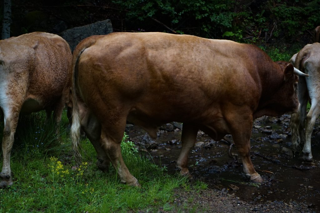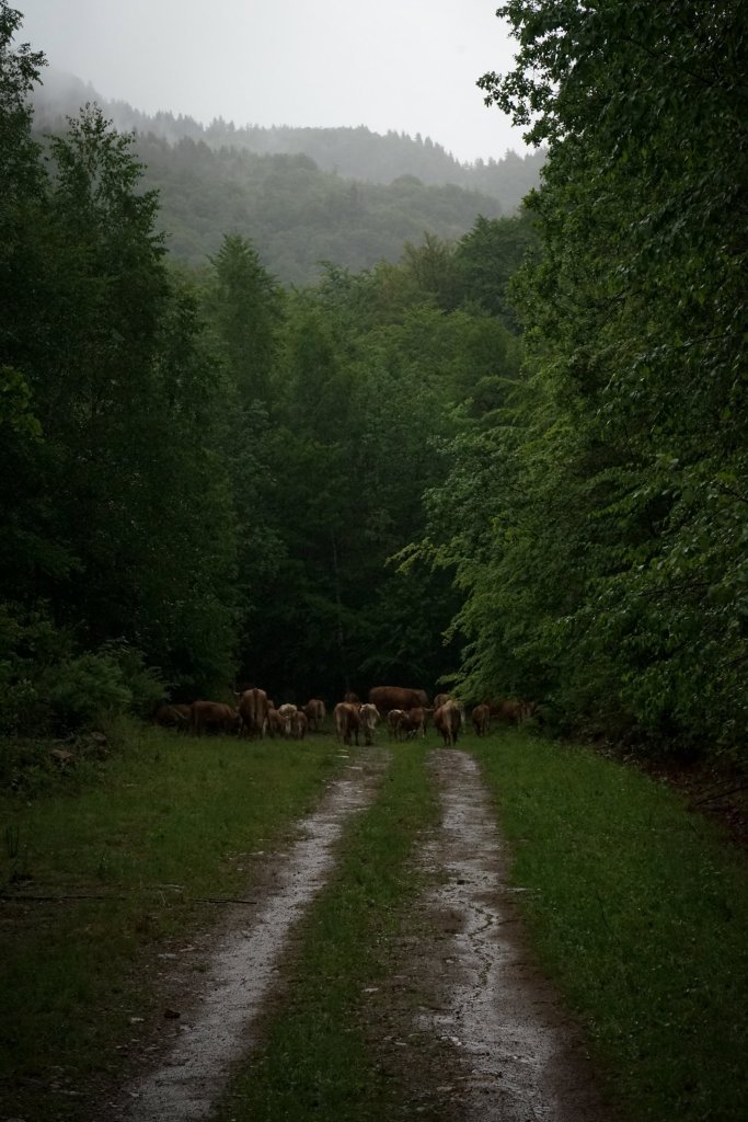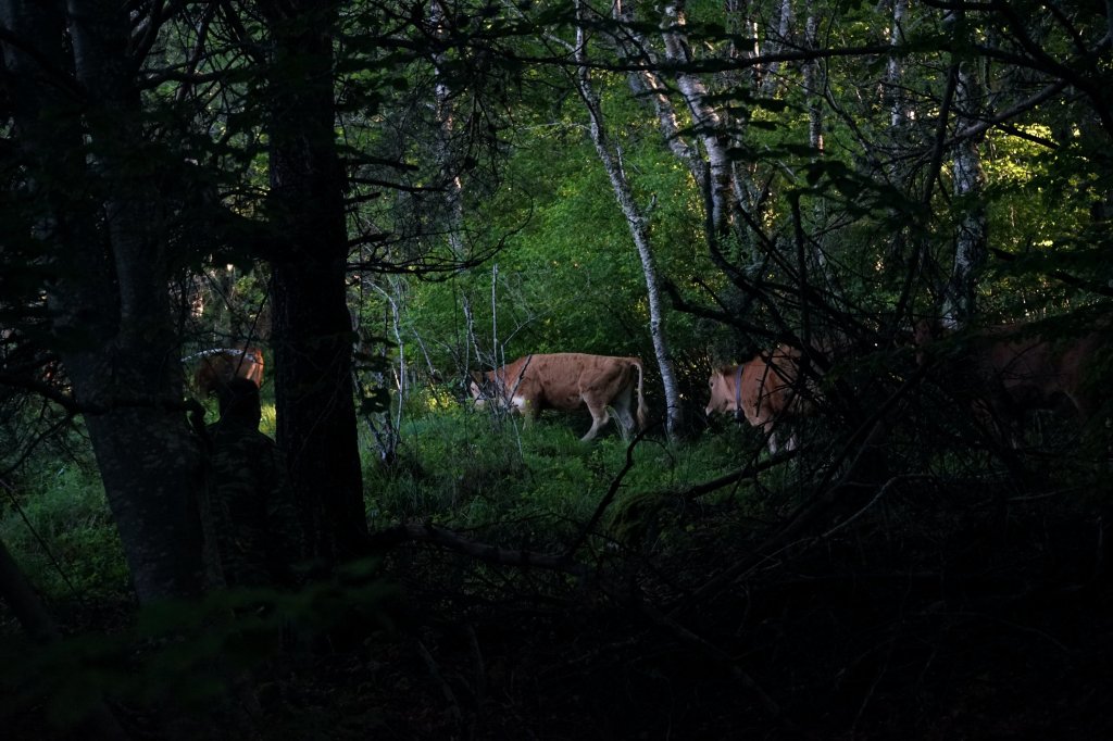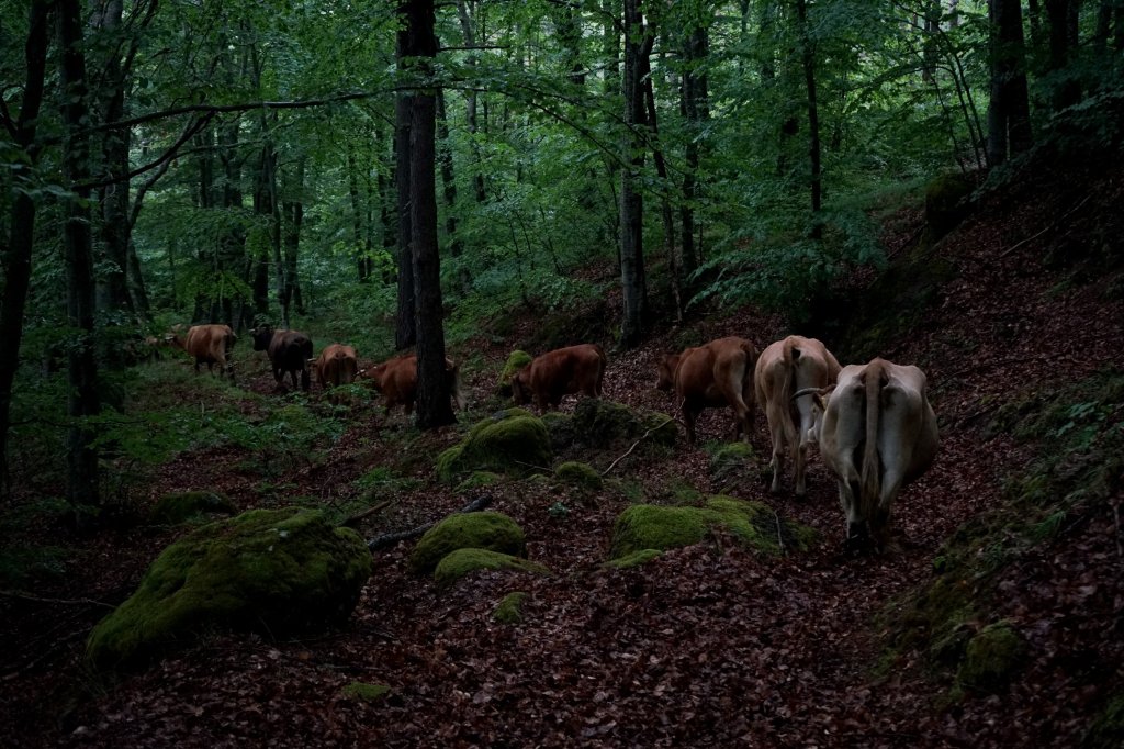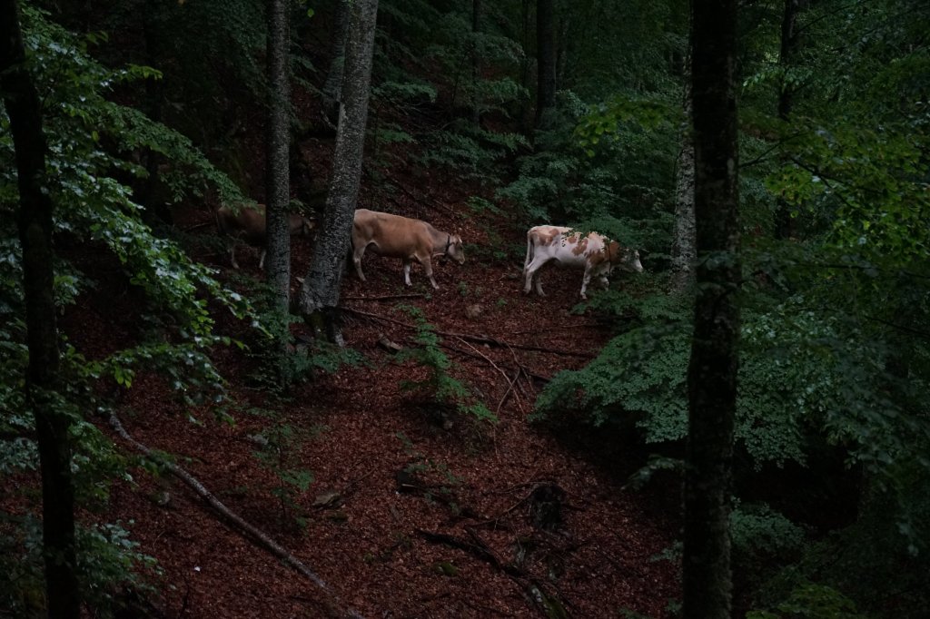 Στη διάρκεια της ανάβασης, μέσα από κλαδιά, ανοίγματα και τις σκιές των δέντρων, παρατηρώ τις αγελάδες, τα μικρά μοσχαράκια, τις ηλικιωμένες και τον εντυπωσιακό ταύρο. Κάθε βήμα προς την κορυφή είναι για αυτές εύκολο· μια χαλαρή διαδικασία με συνεχείς στάσεις για γεύματα. Ενώ εμείς με τα άγχη μας, ο καθένας για τους δικούς του λόγους, και με μια εμφανή σωματική προσπάθεια.
