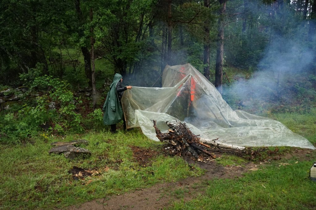 ” Τα βρεγμένα ξύλα “σφύριζαν” και άφριζαν ανάμεσα στις φλόγες μέχρι να χάσουν την υγρασία τους, έπειτα καιγόντουσαν κι αυτά κάτω από το ψιλόβροχο που ακόμα δεν έλεγε να σταματήσει. Εμείς πάλι για ώρες προσπαθούσαμε να στεγνώσουμε δίπλα τους, μάταια όμως· ήμασταν μούσκεμα μέχρι το κόκαλο.