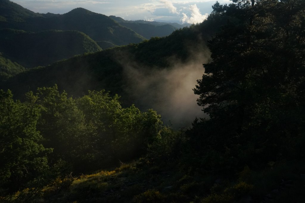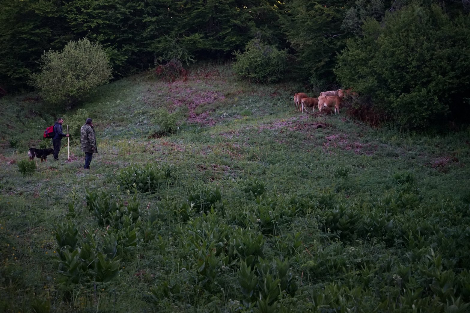 Μετά από λίγο βρισκόμαστε στην τρίτη (πρώτη για εμένα) αυτοσχέδια κατασκήνωση, λίγο πριν από την τελευταία ώθηση προς την κορυφή και το “Μεγάλο Λιβάδι” . Το κοπάδι είχε απομακρυνθεί από εμάς και είχε βρει καταφύγιο μέσα στο πυκνό δάσος. Μαζί του και δύο από τα τέσσερα σκυλιά που το συνόδευαν σε όλη τη διαδρομή.