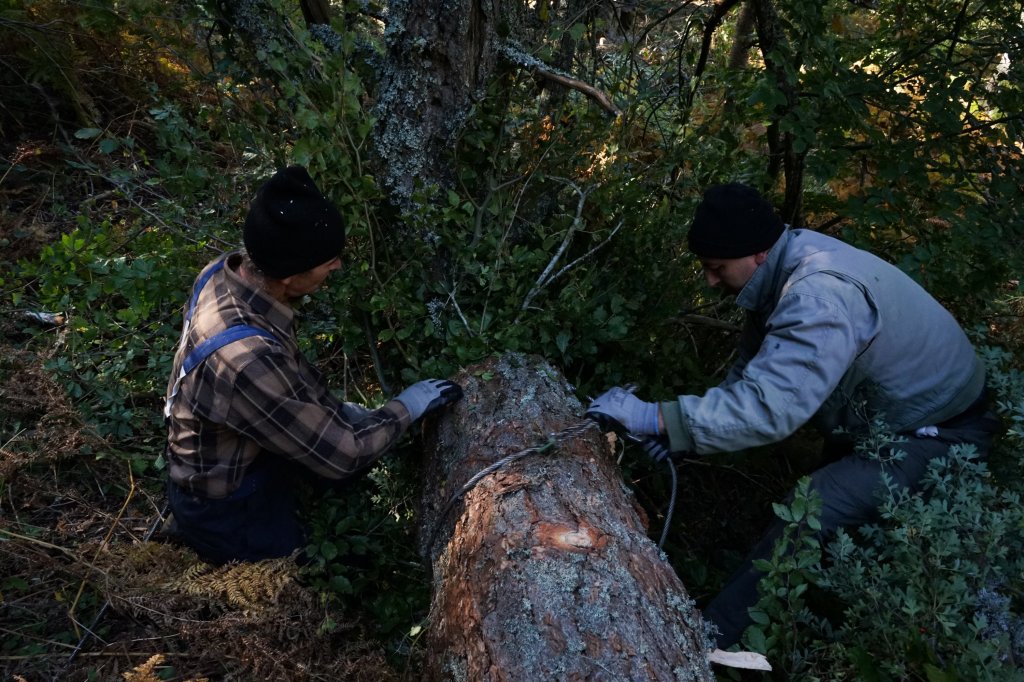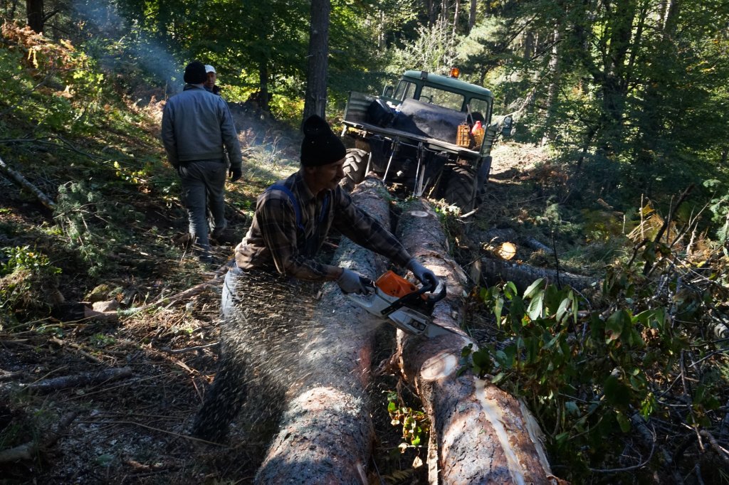 Φθάνοντας πρωί, τους πετυχαίνω στο πρώτο διάλειμμα. Οι εργασίες εδώ γίνονταν με το Ούνιμακ, ένα υπερυψωμένο τετρακίνητο με μεγάλες ρόδες και δυνατό βίντζι! Δουλειά του αλλά και δουλειά τους ήταν να τραβούν και να μεταφέρουν τεράστιους κορμούς μέσα από το δάσος στον δασικό δρόμο, δουλειά επικίνδυνη όσο και απαιτητική. Ο Ισμέτ έκοβε το δέντρο και το καθάριζε από τα κλαδιά του και μετά ο Ραμαντάν με έναν ακόμη το σκάλωνε στο συρματόσχοινο και το έβγαζε από το δάσος. Νόμιζα ότι θα μου ήταν δύσκολο να βλέπω δέντρα από το αγαπημένο μου δάσος να κόβονται ( και ίσως ήταν για λίγο), αλλά ο σεβασμός και η φυσικότητα με την οποία κινούνταν όλοι τους, έκανε την όλη διαδικασία εύκολη.