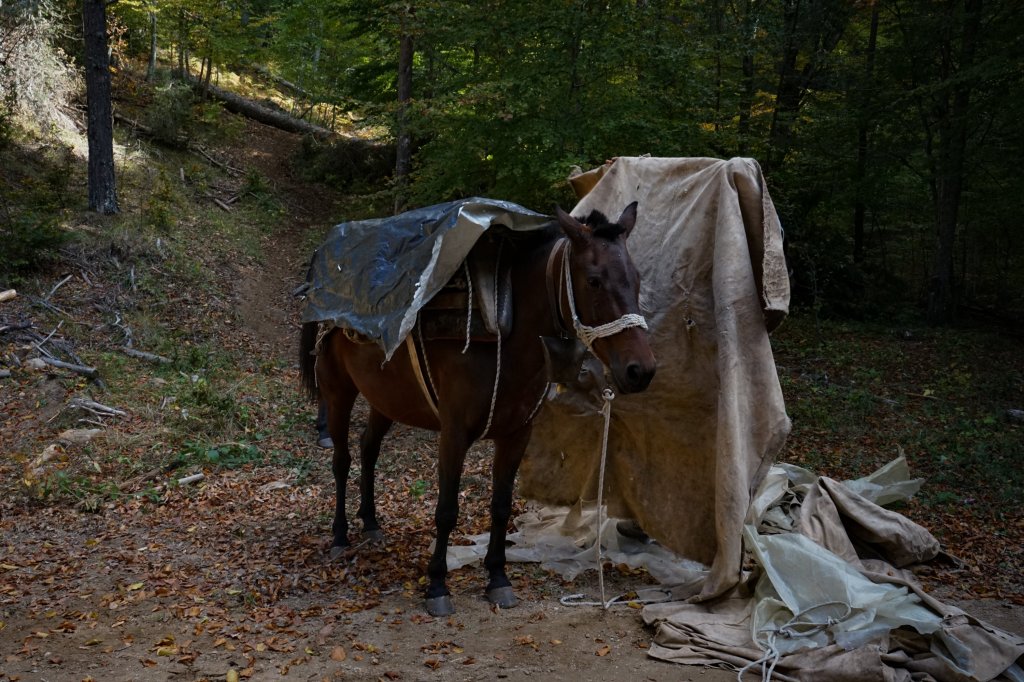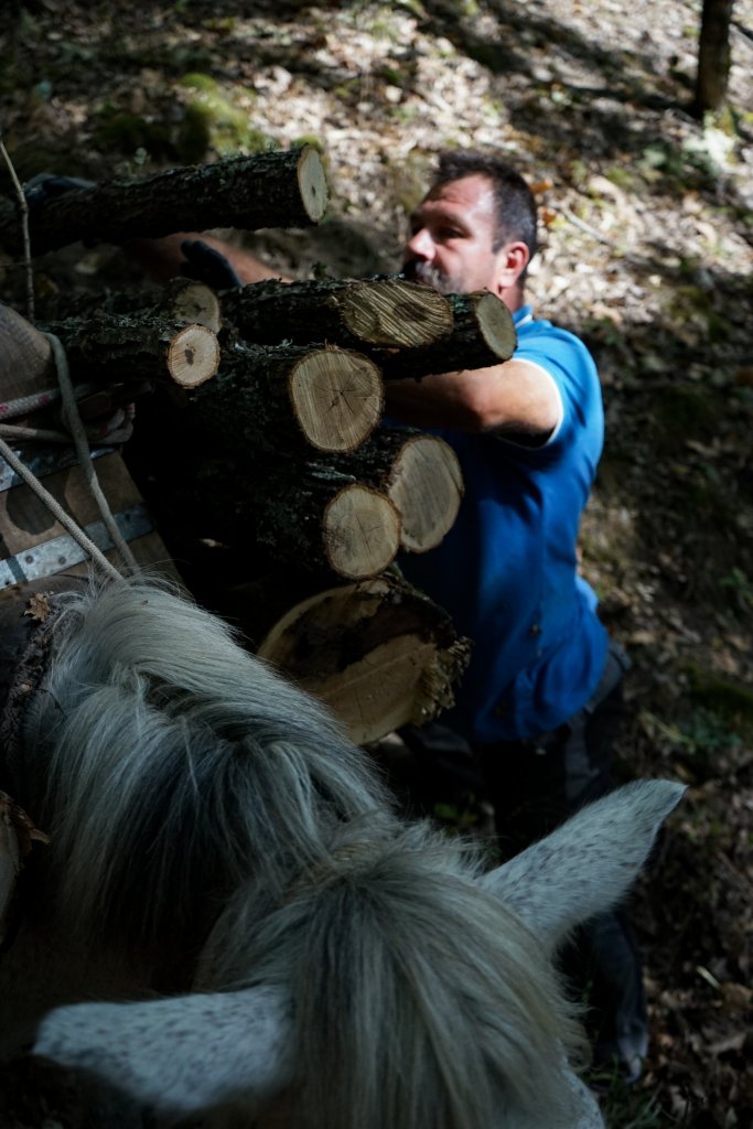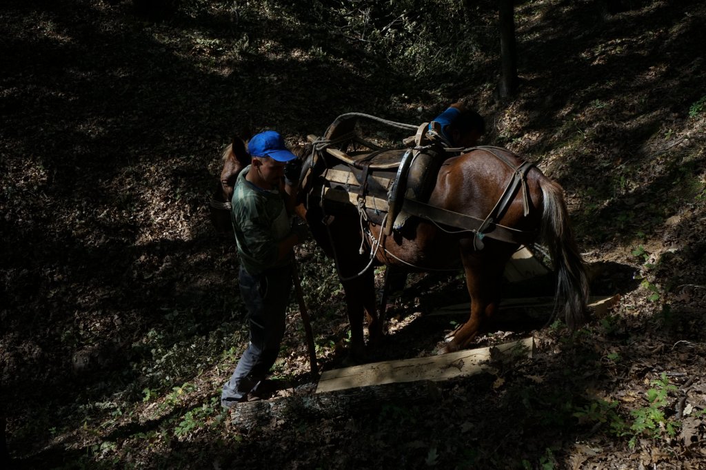 Κατεβαίνω, λοιπόν, στον κάτω δρόμο και τους συναντώ… έκαναν τσιγάρο, μέχρι τα ζώα να πάρουν μία ανάσα. Συστηνόμαστε αλλά νομίζω τυπικά, μιας και τα νέα στο δάσος, τελικά, κυκλοφορούν γρήγορα. «Εσύ είσαι ο φωτογράφος που ήσουν εχθές στο χωριό;» μου λέει ο Κενάν, χαμογελώ συγκαταβατικά. Τα λέμε και μοιράζεται μαζί μου τις εμπειρίες και τις σκέψεις του, τη ζωή του στην Αθήνα με τις σπουδές και τις προσπάθειες να εργαστεί ως φιλόλογος. Το δάσος μπορεί να προσφέρει δουλειά, σκέφτομαι, αλλά είναι δύσκολο να αφήνεις αυτό που αγαπάς και έχεις σπουδάσει. Σε λίγο ο πάντα ανυπόμονος για δουλειά αδελφός του μας “τραβά” στα ζώα και το δάσος. Εκεί με θαυμασμό κοιτώ τις όλο μαεστρία κινήσεις φορτώματος των ζώων με ξύλα. Τις “πατερίτσες” και τα απλά αλλά αποτελεσματικά δεσίματα με τα σχοινιά, τον τρόπο που σηκώνουν το ξύλο για φόρτωση αλλά και τα άλογα, που ένα ένα παίρνουν το μονοπάτι της επιστροφής προς το δασικό δρόμο και το μέρος που τελικά θα απαλλαχθούν από το βάρος τους. Αργότερα μας προφταίνει και ο μπαμπάς τους για να βοηθήσει στο μάζεμα και τις τελευταίες εργασίες πριν αφήσουν τα ζώα για το βράδυ.
