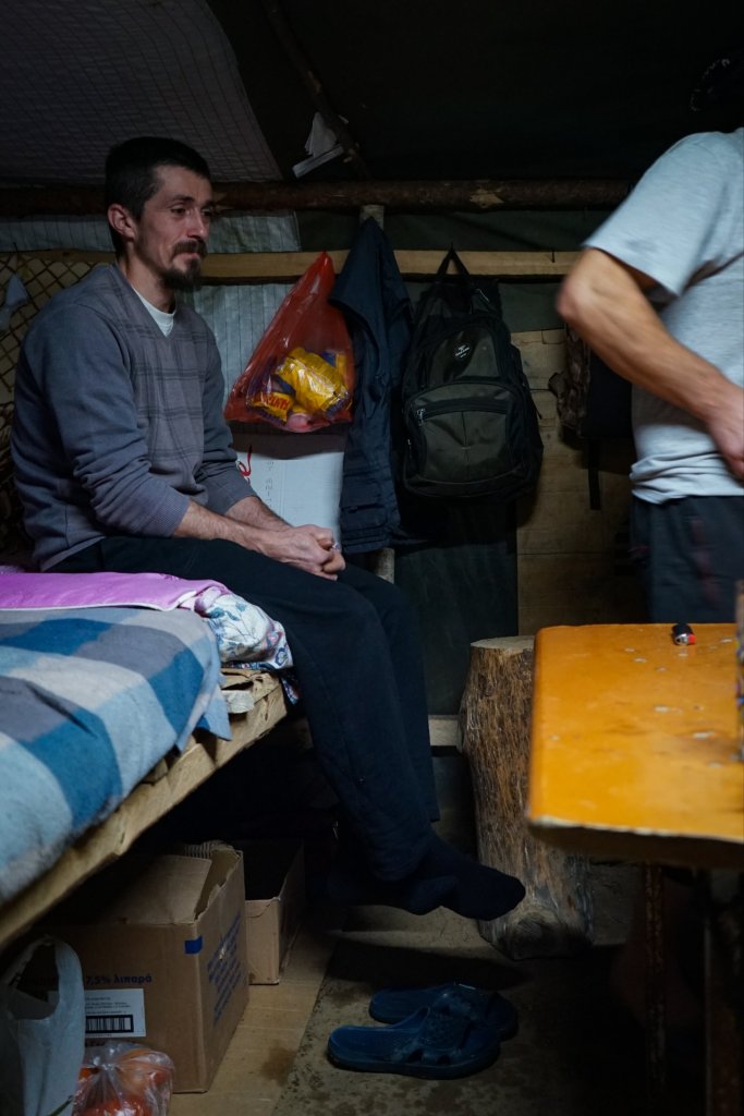 Στην πόρτα μπροστά βλέπω τον Μουστάκα. Με χαιρετά θερμά και με προσκαλεί μέσα. Πίνοντας καφέ ανάμεσα σε κούτες, ανάποδες καρέκλες και πολυάριθμες φωτογραφίες από τα κυνηγετικά κατορθώματα των θαμώνων, προλαβαίνουμε να πούμε δυο κουβέντες πριν να πλακώσει κόσμος. Ο γιός του, μου λέει, θα ερχόταν αργότερα μιας και είχε κατέβει στην Ξάνθη για τις προμήθειες του παντοπωλείου. Ήταν αυτές οι μέρες αργίας που οι περισσότεροι ξυλοκόποι είχαν την ευκαιρία να δούνε την οικογένεια και να προμηθευτούν τα απαραίτητα για άλλη μία εβδομάδα στο δάσος. Θα καθόμουν λίγη ώρα στο χώρο βγάζοντας φωτογραφίες και κάνοντας μερικές όμορφες συζητήσεις, πριν τελικά φύγω για να βρω ένα μέρος να στήσω τη σκηνή μου.